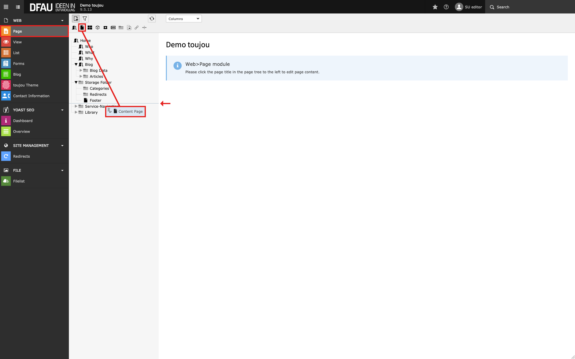 - Click on the black document icon (»Content Page«) and drag and drop it to the desired position within your page tree.