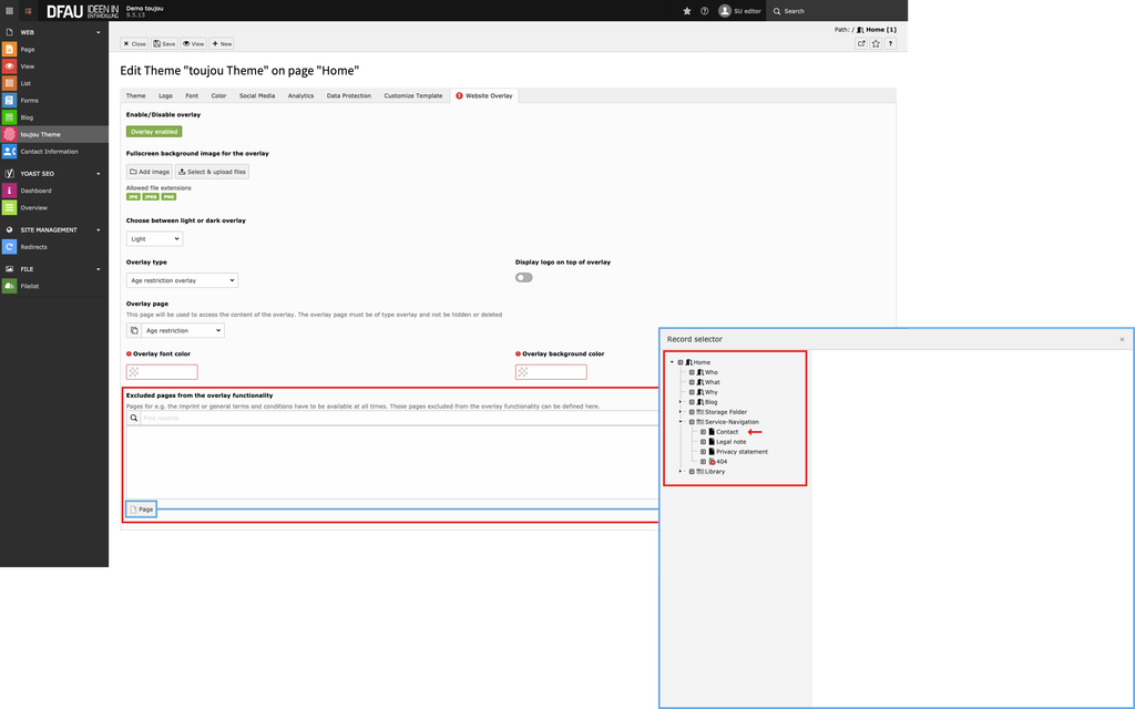 - To do so, click on the Page button. The Record selection will open, in which your page tree will be displayed. Click on the corresponding page that you want to exclude from the overlay function. In our example: Contact.