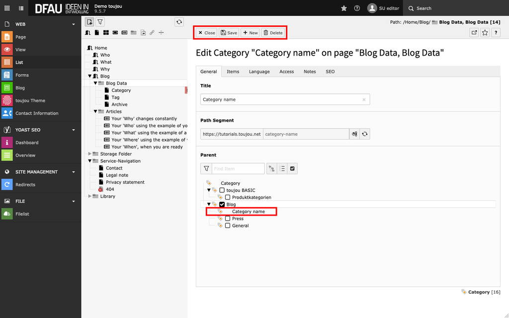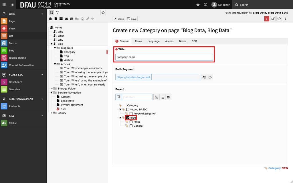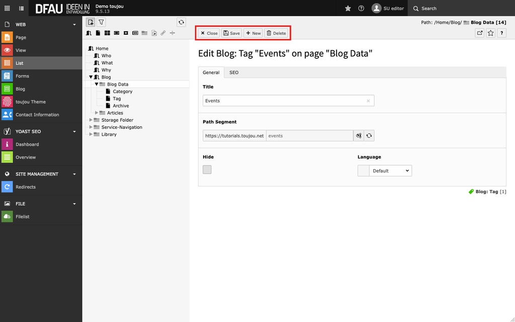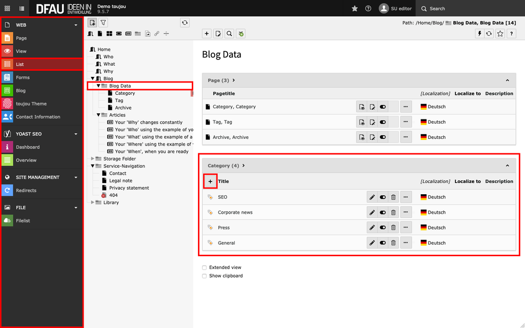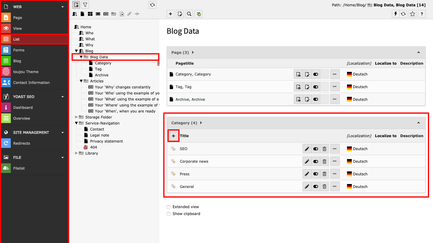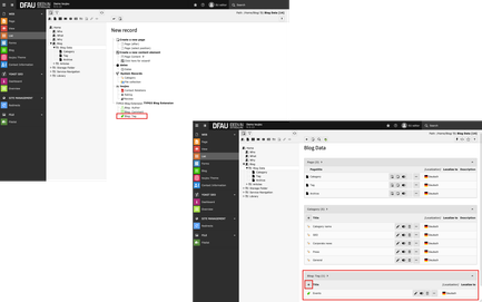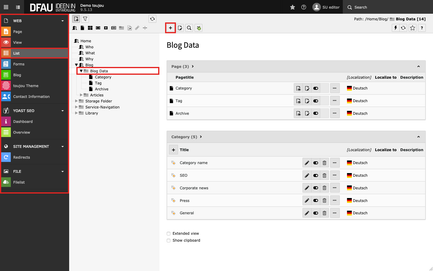 - In the page tree, expand the subsection under the navigation item Blog and click the Blog Data folder.