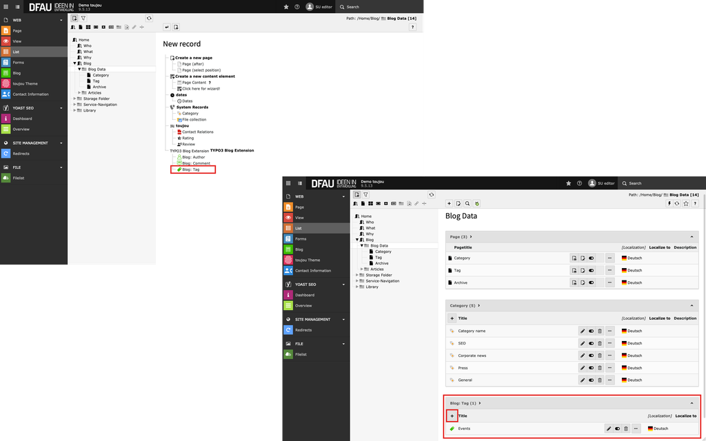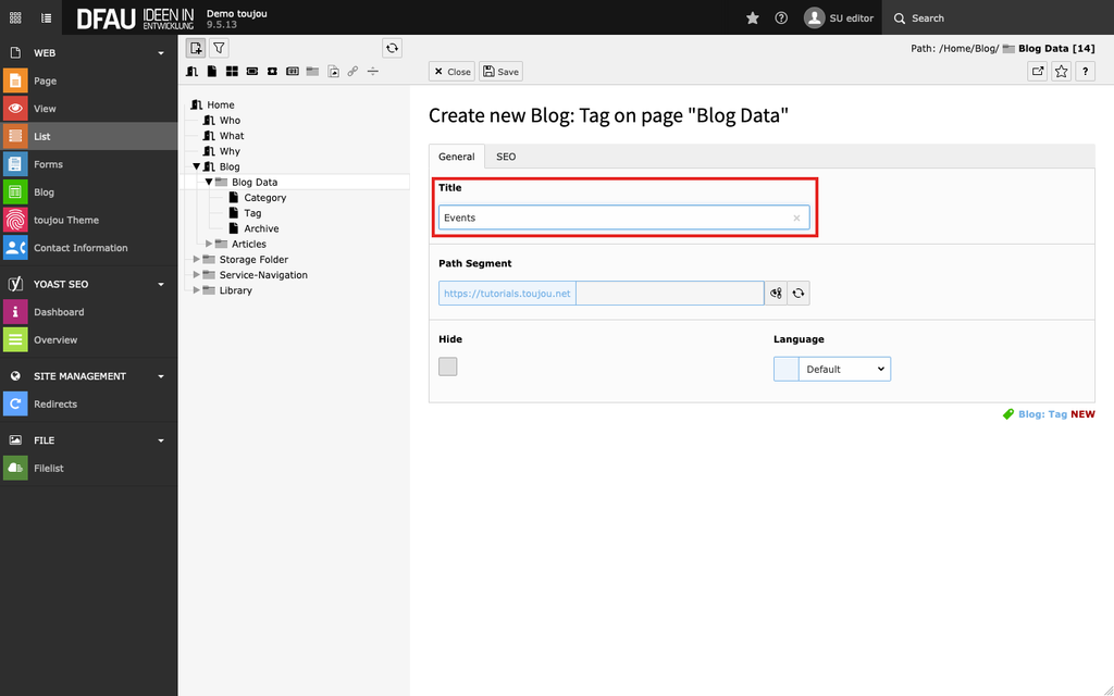 - If you are creating tags for the first time, under TYPO3 Blog Extension click on the last item Blog: Tag.