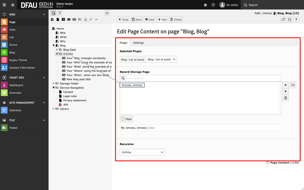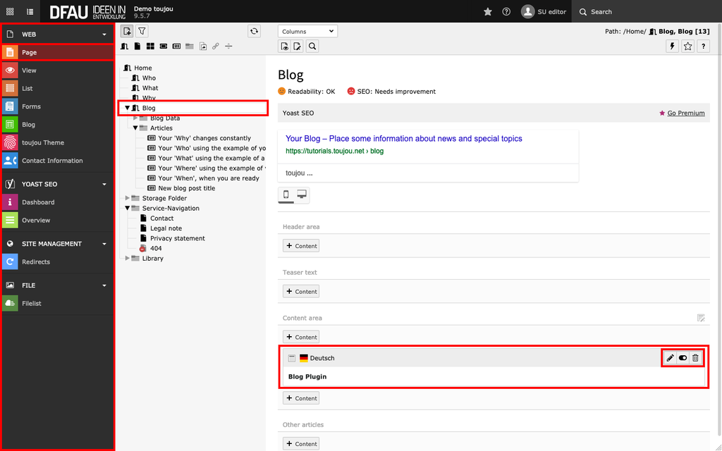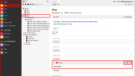 - In the Content area of the page you will find the Blog Plugin integrated as an element.