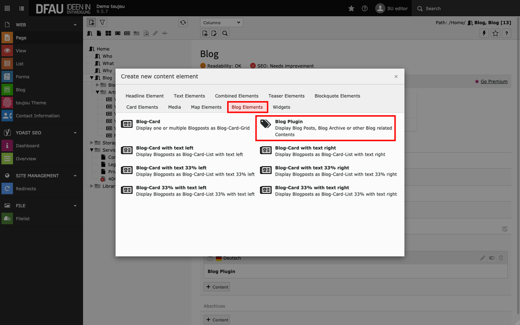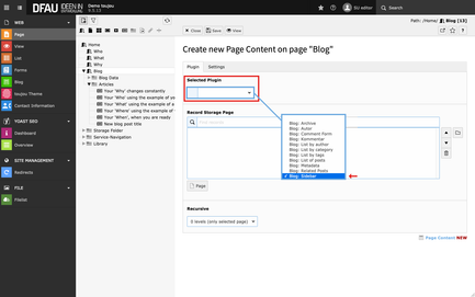 The blog plugin is a content element that is listed in the Blog Elements tab when new content elements are created. However, this plugin differs significantly from classic content elements, since no content is entered here, but in the options when different effects are selected.