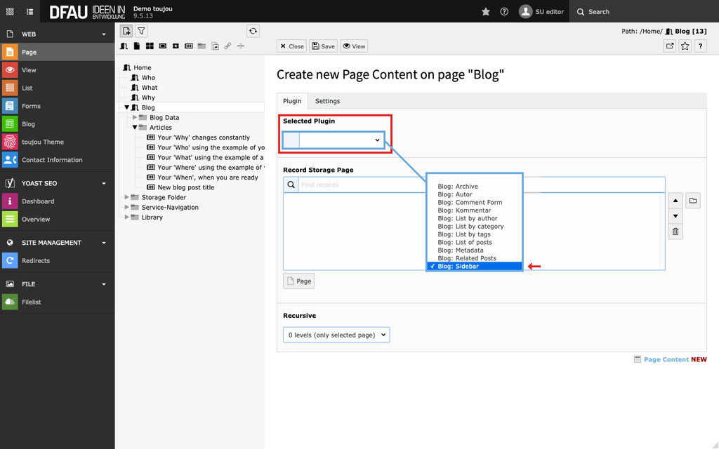 - In the Plugin tab, select Blog: Sidebar from the drop-down menu in the Selected Plugin section.