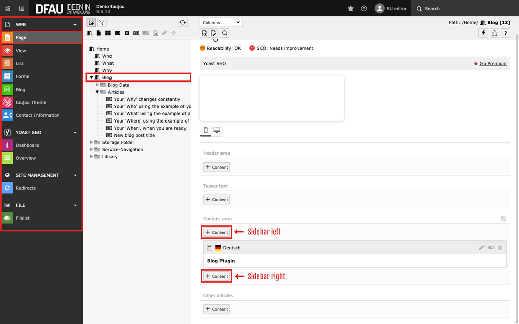 - To create a sidebar on the left side of your blog posts, click + Content above the already existing plugin. To create a sidebar on the right side of your blog posts, click on + Content below the already existing plugin.