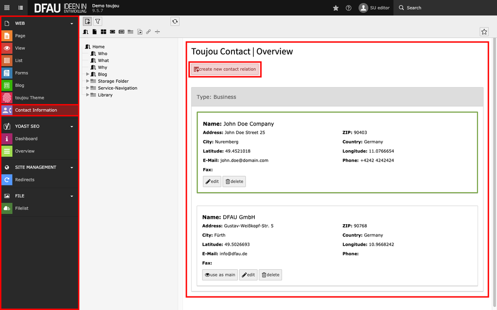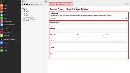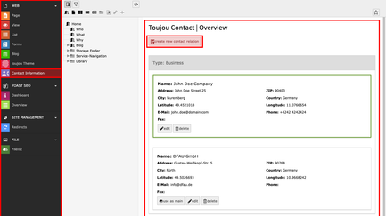 With toujou, your contact data will be controlled centrally. All you need is one click, and your entire website will be up to date. Information like your company address, contact persons, and departments are entered once and then can be integrated as content elements on any page.