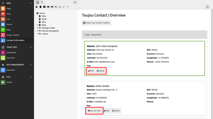 - On the overview page, the green frame in the box Type: Business indicates which address can currently be seen as main address on the website.