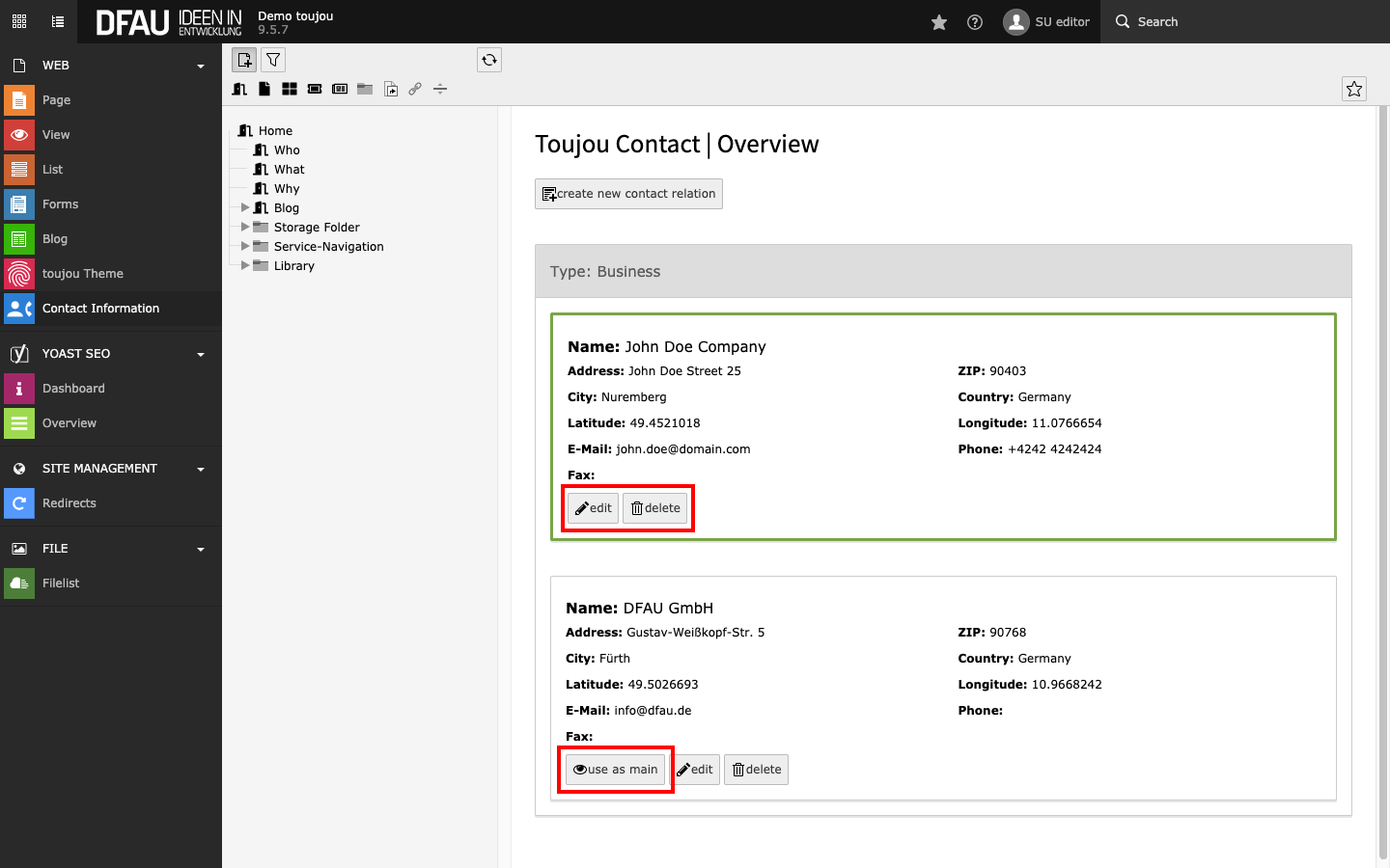 - You can change the entry by clicking on the edit button. An alternative entry is activated with the button use as main.