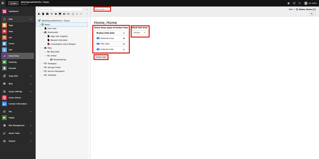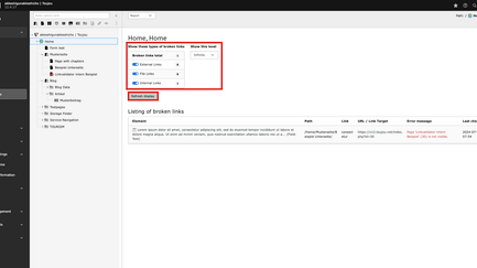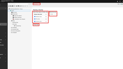 Level selection: With this option, you can decide the number of levels that are taken into account when querying data and displaying broken links. One single level represents one hierarchy level in the page tree. Giving you an example, for the screenshots of the step by step guide above, Home would be a level, the pages Form test, Sample page, Blog etc. would be a new level below.