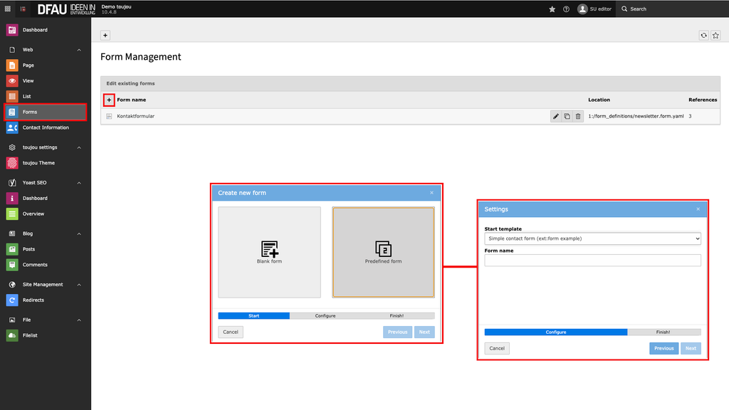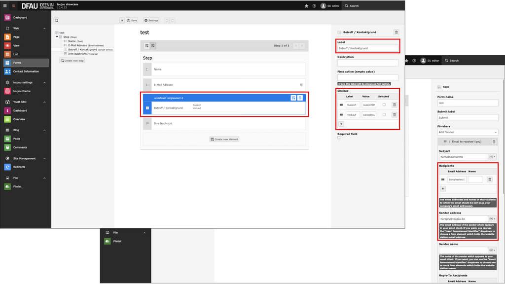 In this tutorial, you'll learn how to create forms and how your toujou back end menu differs from other TYPO3 installations. For functionality, the TYPO3 forms module is entirely at your disposal.