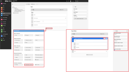 - First select the Repeatable Container from the elements in the form. Then click on the element in the form (right screenshot) to have it displayed within a blue frame. Click on the + icon and select the option inside to add more elements to the container. Please note: You are free in the selection and number of elements you can add.