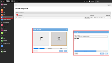 - Click on + Form name to create a new form. A new pop-up window will appear. With TYPO3 Version 10 you have the choice between a blank form and a predefined form. The predefined one uses an existing arrangement of elements from another form. If you choose this one, you have to select the appropriate form in the next step (see screenshot).