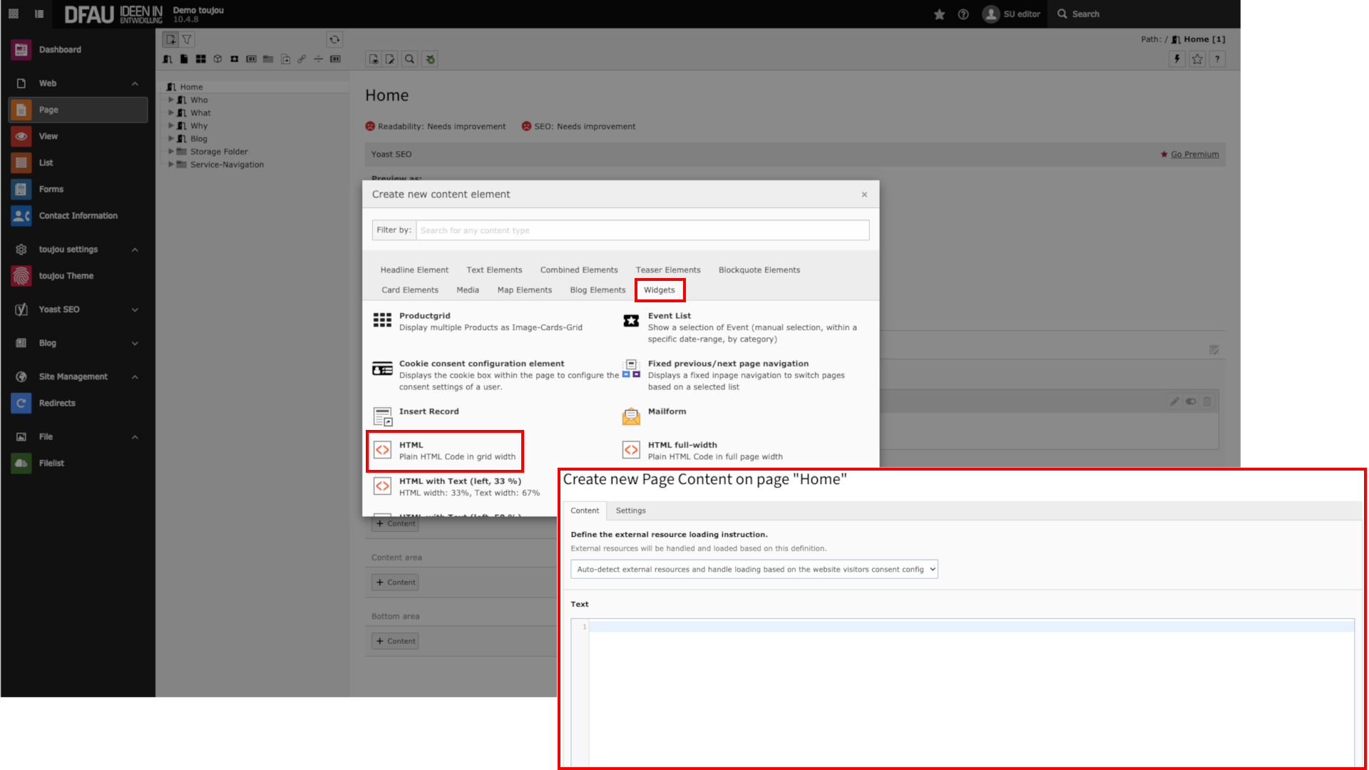 - For the newsletter subscription to appear in the front end as a form, you need to create a new content element on the desired page. Click on the + Content button and then on the widgets tab on the desired HTML element. For example, if you want a form to extend to text width, you can choose HTML.