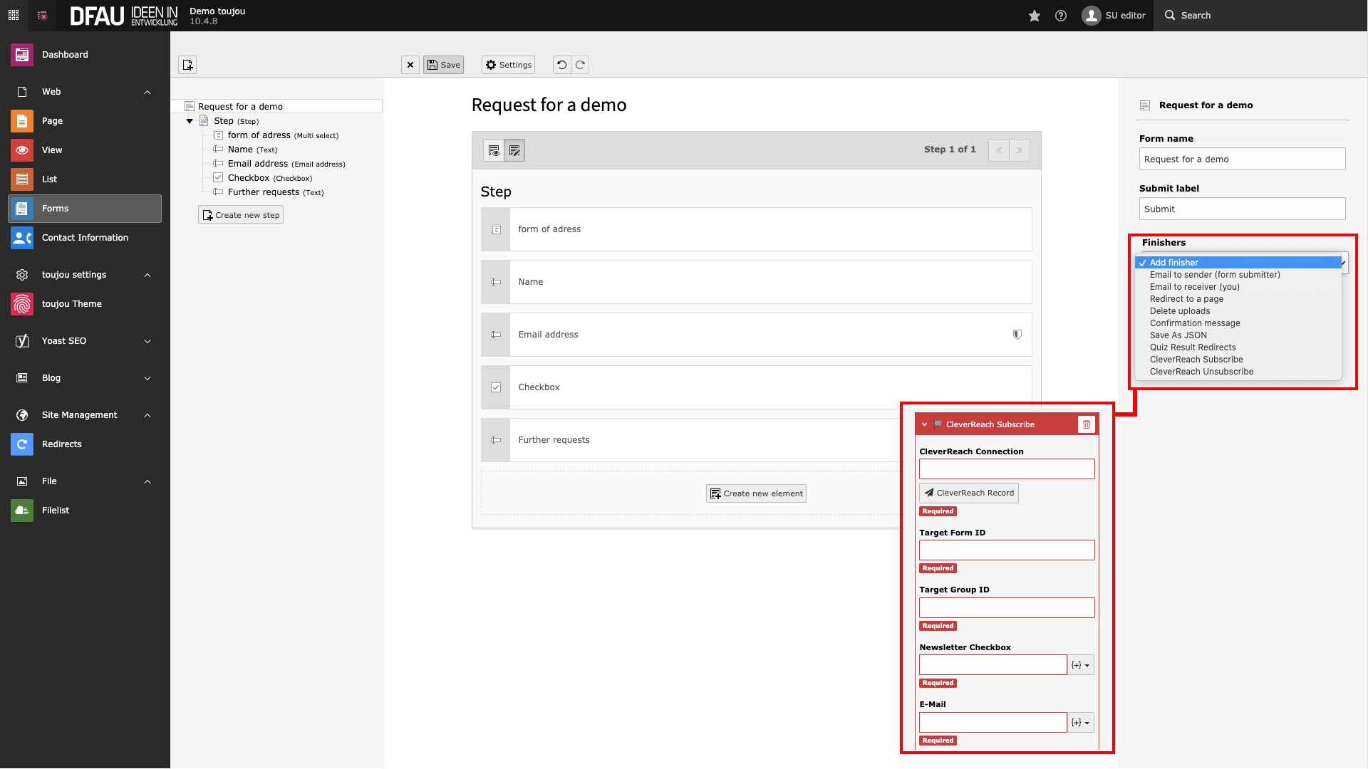 - To finalize the link the form data and CleverReach you need to create a finisher. Click on the drop-down menu Add Finisher and select CleverReach Subscribe. A CleverReach form opens in a new window.