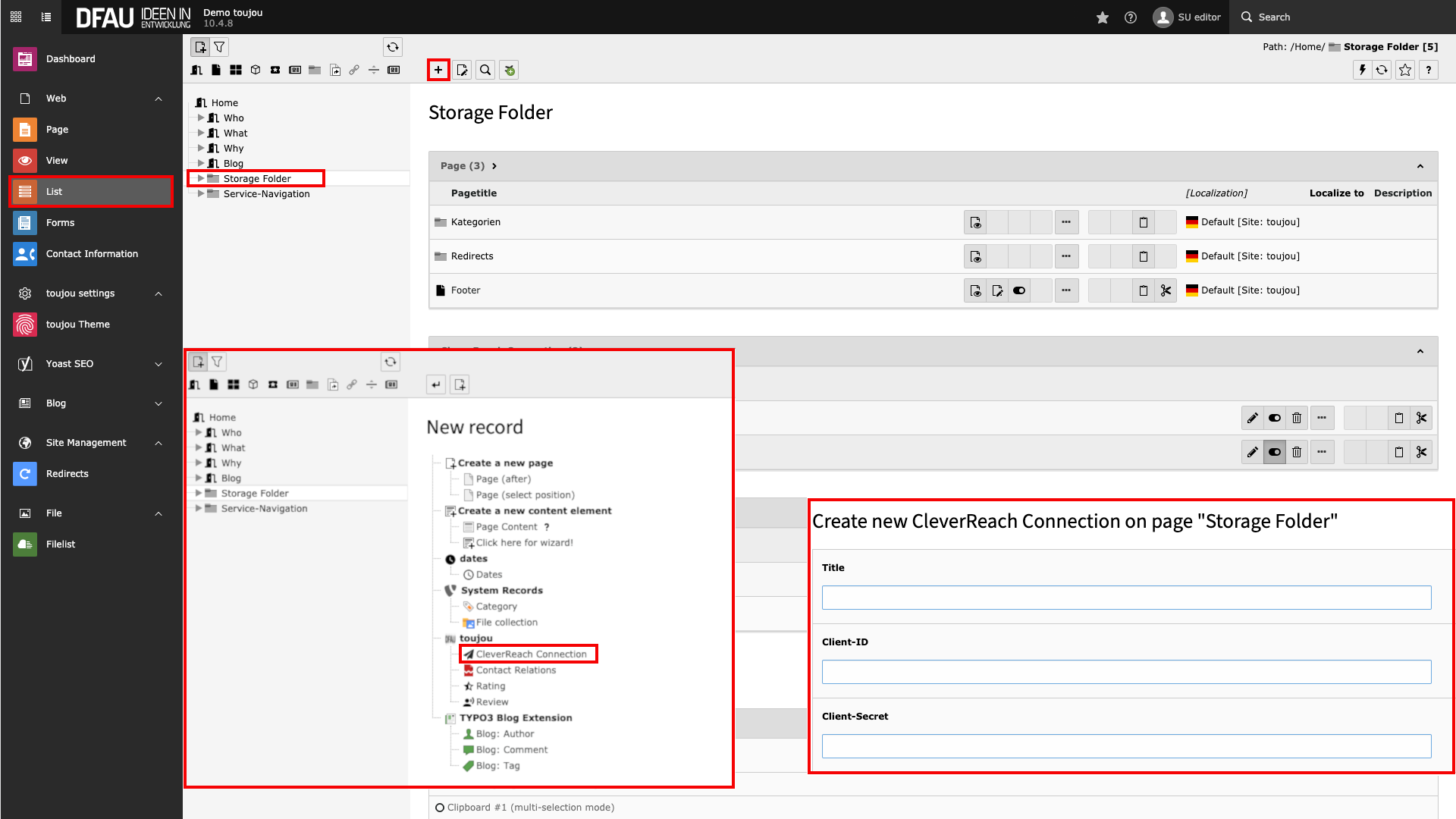 - To do so, click on the List view in the module list, then on Storage Folder in the tree view and then the cross icon. When you press the CleverReach Connection button in the toujou section (left box) you then open a new folder.