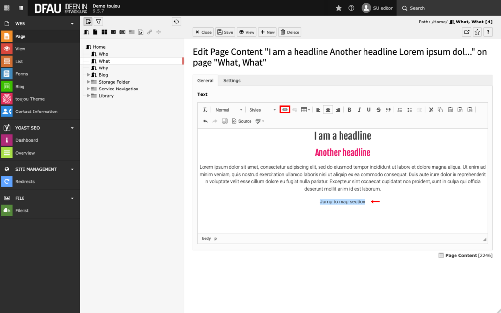 Anchor links allow you to link within a page of your website or to point directly to page sections of other subpages. In this tutorial you will learn how to create anchor links in toujou/TYPO3.