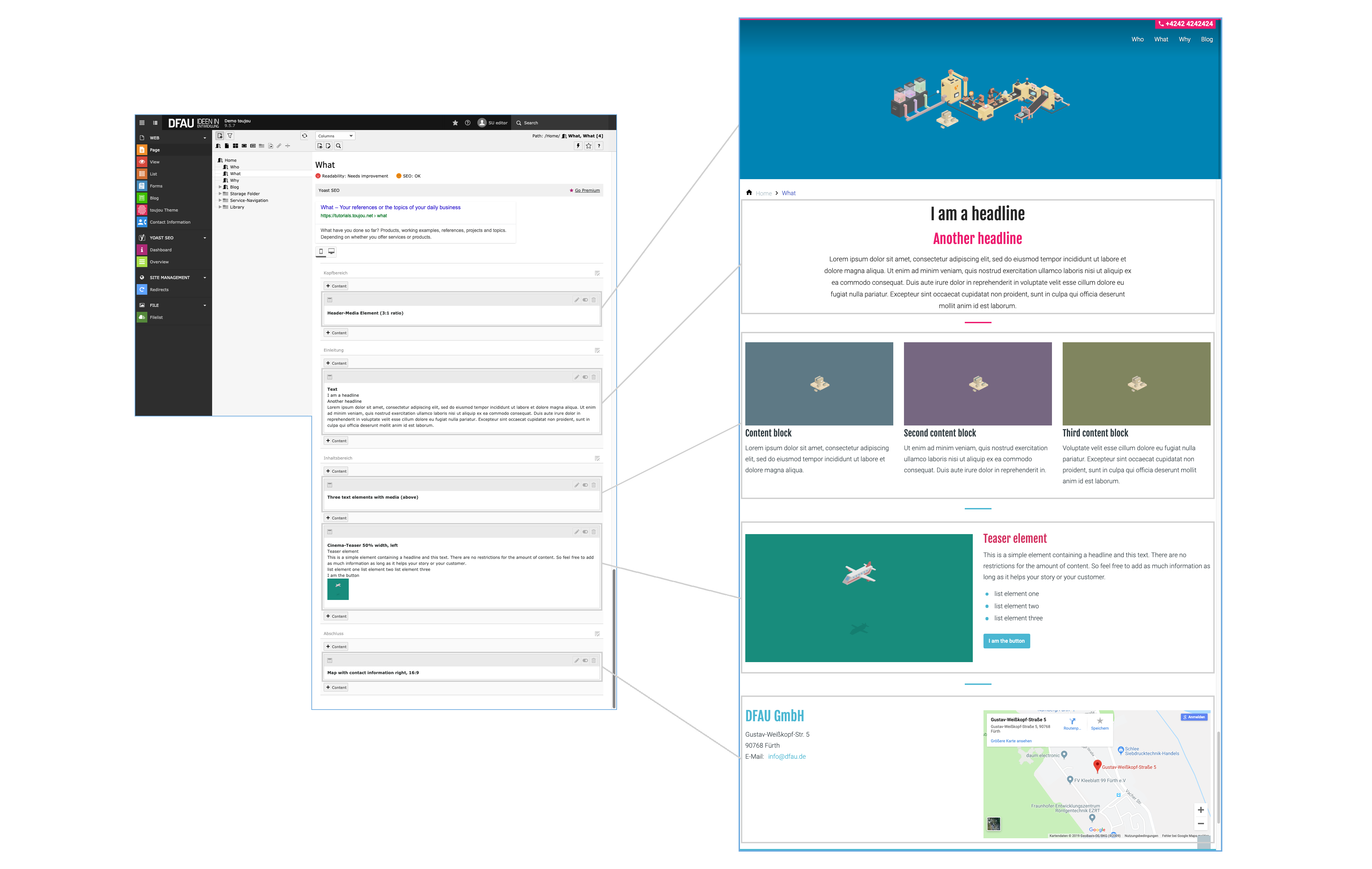 The prerequisite for setting anchor links are content elements that give structure to your page. The following image shows a comparison of the backend and frontend views of a content page. Our sample page consists of five content elements: Starting from a header image, then an introductory text, illustrated text blocks, a teaser element and finally a map element. In the instructions described above, we have set an anchor from the top of the page to the map element.