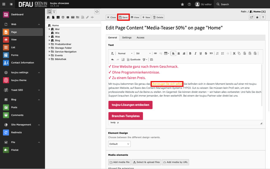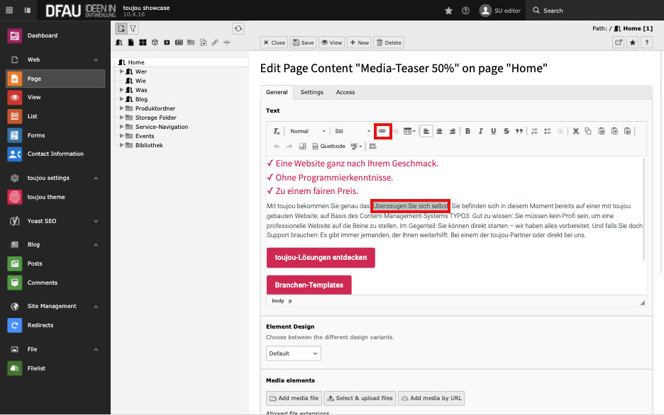 toujou is based on TYPO3 and anyone familiar with TYPO3 knows that there are many different options to use to reach your desired results. We would like to point out important information and little tricks that can assist you when you’re creating and editing your website.