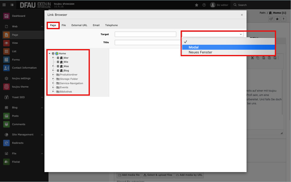 If you want to open an image or video as a modal, it must be previously stored in your file list in the TYPO3 backend. The page title in the modal corresponds to the page title that is also shown in search engines. To edit the page title you have to go to the SEO tab in the page properties.