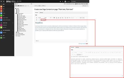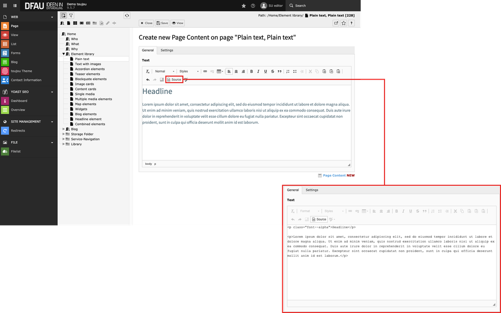Editing the source code within the rich text editor (RTE) is for troubleshooting only in the rare case that the text you insert should be different than expected in the front end. There should be no reason to insert your own code under normal circumstances.