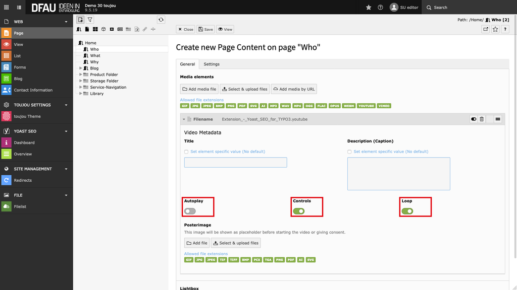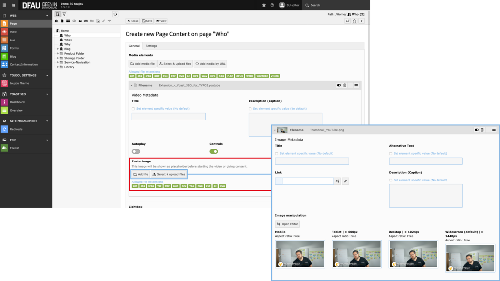 It makes sense to have a closer look at the different play options of videos with toujou and whether it is beneficial to use a thumbnail. With a thumbnail, your site will be more user friendly and provide an image as a placeholder until the video is started. When creating the thumbnail via Select & upload files the video is saved in the User_Upload folder.