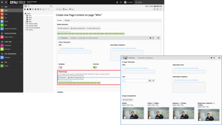 - To create a thumbnail, expand the media element by clicking the arrow located on the left. The editor Video Metadata will open automatically. Then click the Add media file button under Poster Image and select the desired file. You can either choose an existing file in the respective folder or select the corresponding image via Select & upload file.
