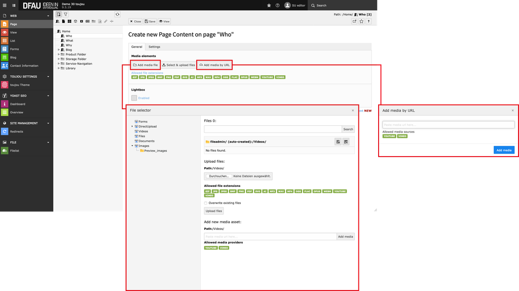 - In toujou there are two different ways of uploading a video to the editor under Media elements by either embedding a video from an external source or as an internal media file. For both of the following instructions the content element will play a minor role as long as the video can be added to it.