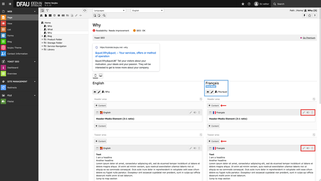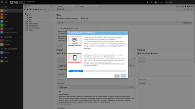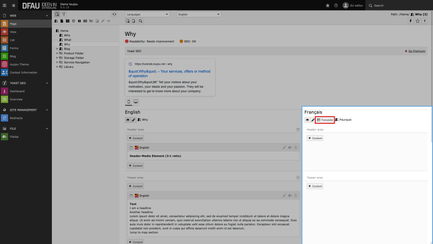 - Located below the mask for the page title, you will see information about the original page title, that will be flagged with the default language. For our example »Why« will become »Pourquoi«.