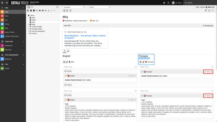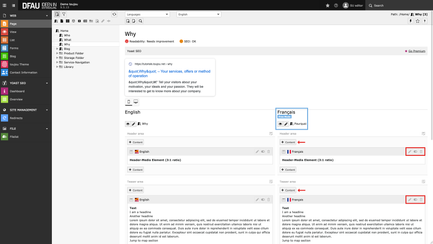 - Additionally you have the possibility to add elements by using the button + Content. These are not related to the default page, but are only displayed in the target language if desired.