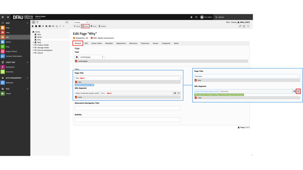 - For more information on editing the URL segment, please refer the tutorial on page properties.