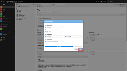 - The URL Segment must also be updated according to your new page title. The URL root has been automatically supplemented with the country code »/fr/«. By clicking on the wheel at the outer edge of the input mask, the system will adopt your new translated page title.
