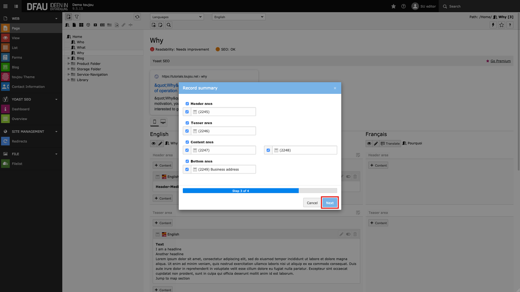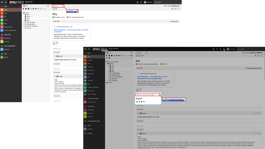 TYPO3 has the integrated components to manage websites that require multiple languages. The default or original language is never explicitly determined by TYPO3, but will be set to German with toujou – unless otherwise requested. Additional languages can also be created by an admin in the back end if requested and then can be used to translate pages and content elements.