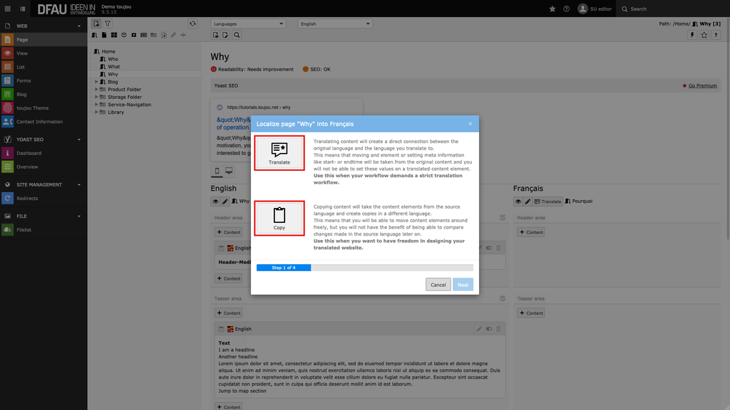 - Copying content will take the content elements from the original source and create copies in a different language.