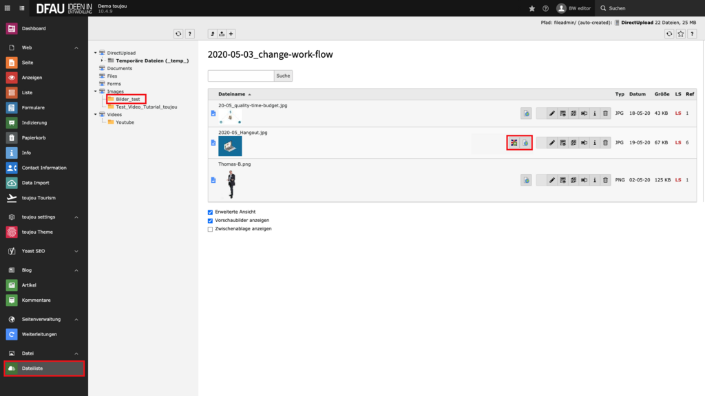 If the globe symbol in the file list doesn't appear, check for the »extended view« of the elements. For this purpose the field "Extended view" must be marked with a tick.