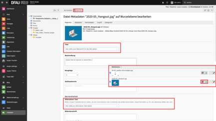 - Enter title and alternative text in the metadata mask, that appears in the pop-up window. The fields »keywords« and »description« aren't crucial for SEO.