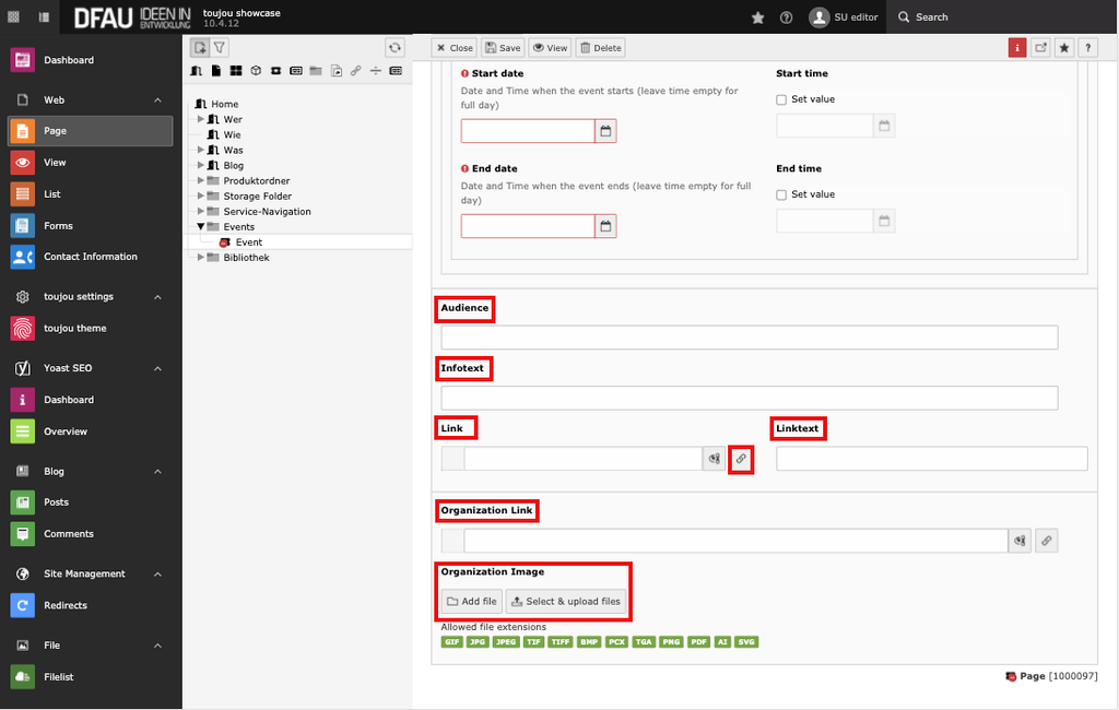 An event page has all the same features that a content page has to offer. You can create a new page with the toujou elements and edit the page properties like SEO or the index search. Please be aware that the information entered in the Event Data tab will only be displayed on an event page if you have also created content elements.