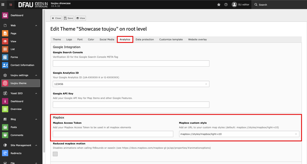 - To enter the access token for your website, click on the toujou Theme in the module bar and then on the Analytics tab.