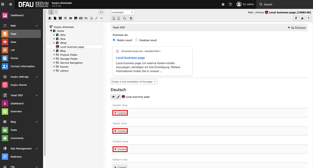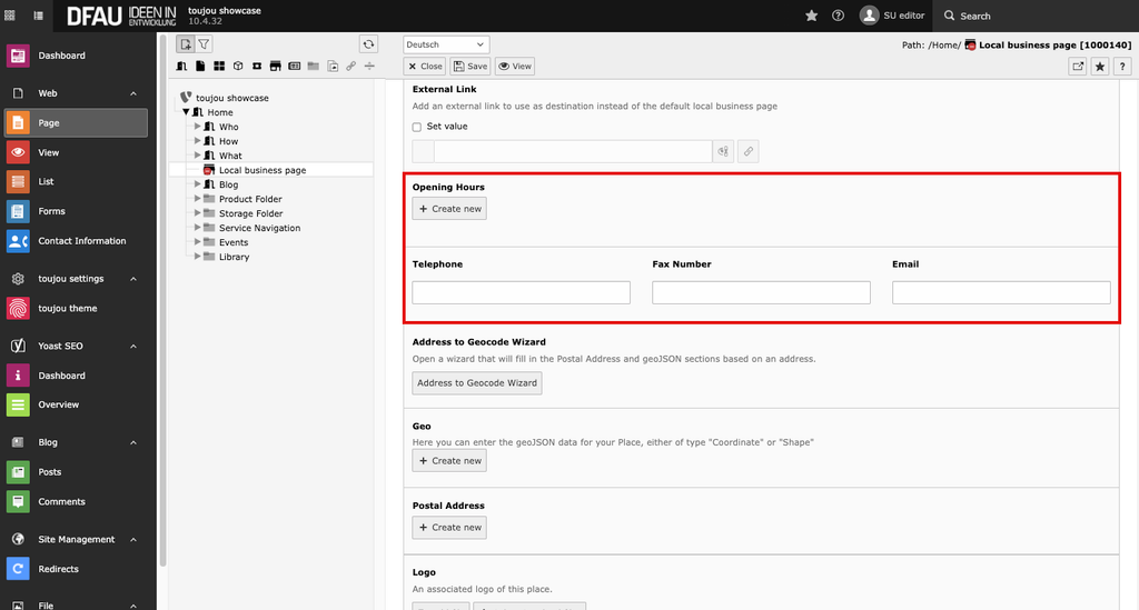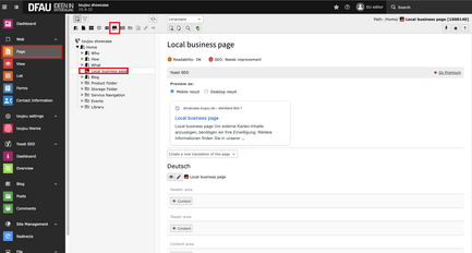 - The local business page offers the same possibilities for content as the other page types in toujou. You can create a page or edit the page properties like SEO or index search. The information entered in the location tab is displayed on the page at all times.