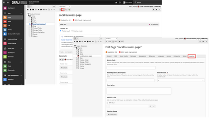 - In order for the locations to be displayed in the location finder, the sliders for »Page visible« and »Page enabled in menus« must be switched to green in the access tab of the page properties of the local business page.