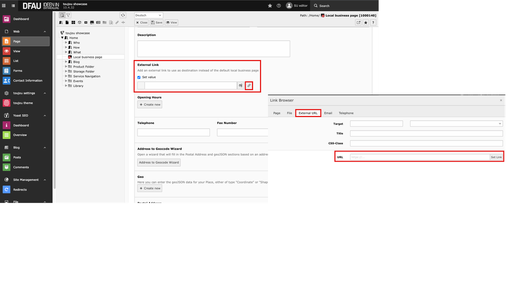 - If you want to link the local business page to an external page you only have to activate the checkbox next to Set value in the section External Link and click the link button (chain icon).