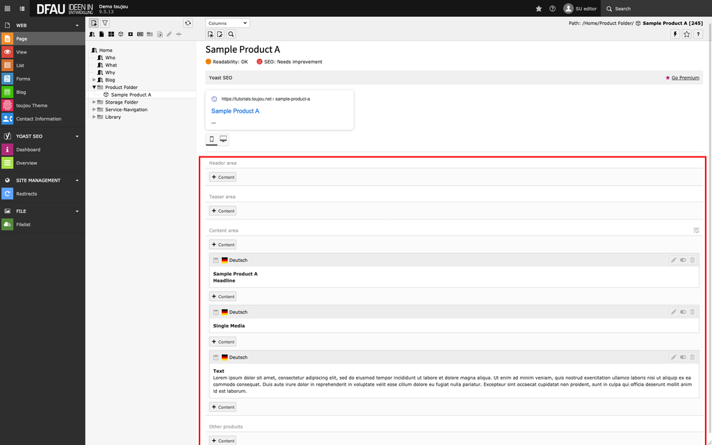 - The page type Product page is divided into four sections, where you can place content elements.
