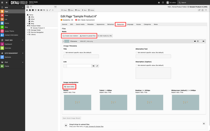 This tab is also relevant for product pages, as a teaser image must be selected separately for display in the cards (buttons Create new relation/select files and upload).