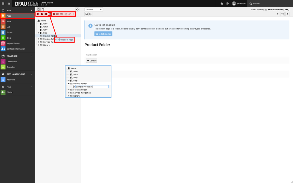 - Above the page tree you will see all available page type icons. Click on the cube icon (»product page«) and drag-and-drop it to the desired location.