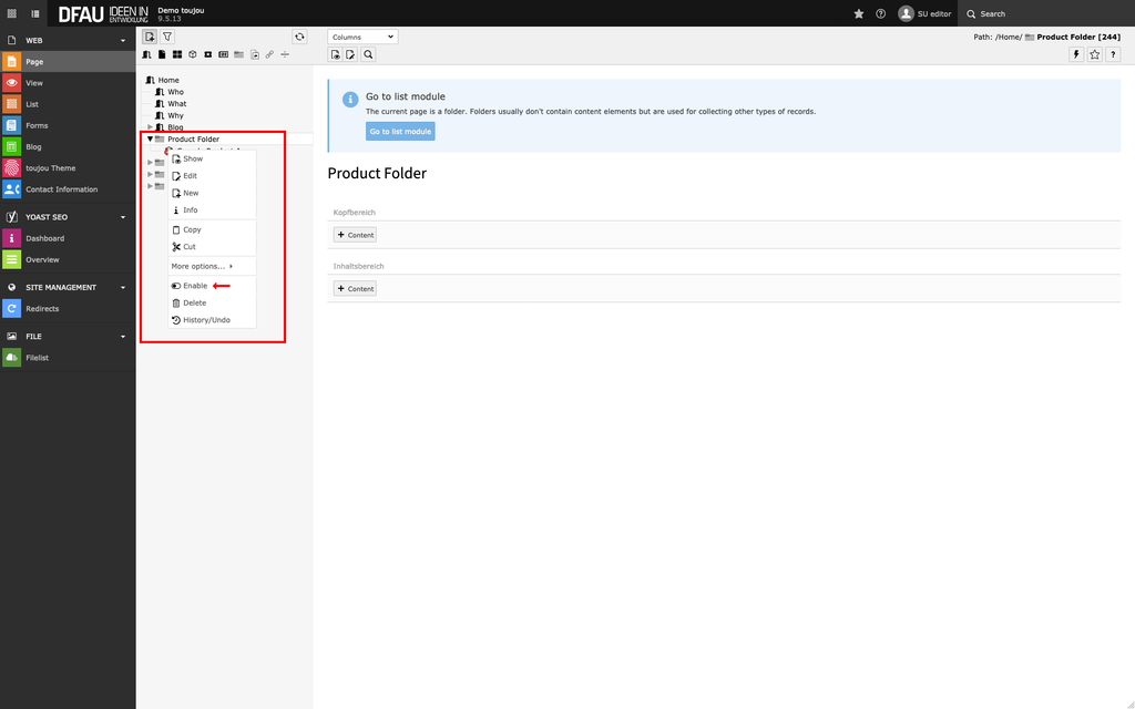 - To make the page visible in the front end, click on the Enable option in the context menu.