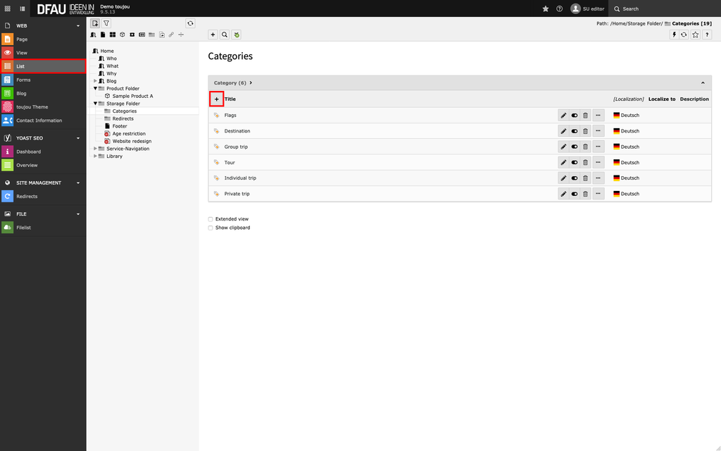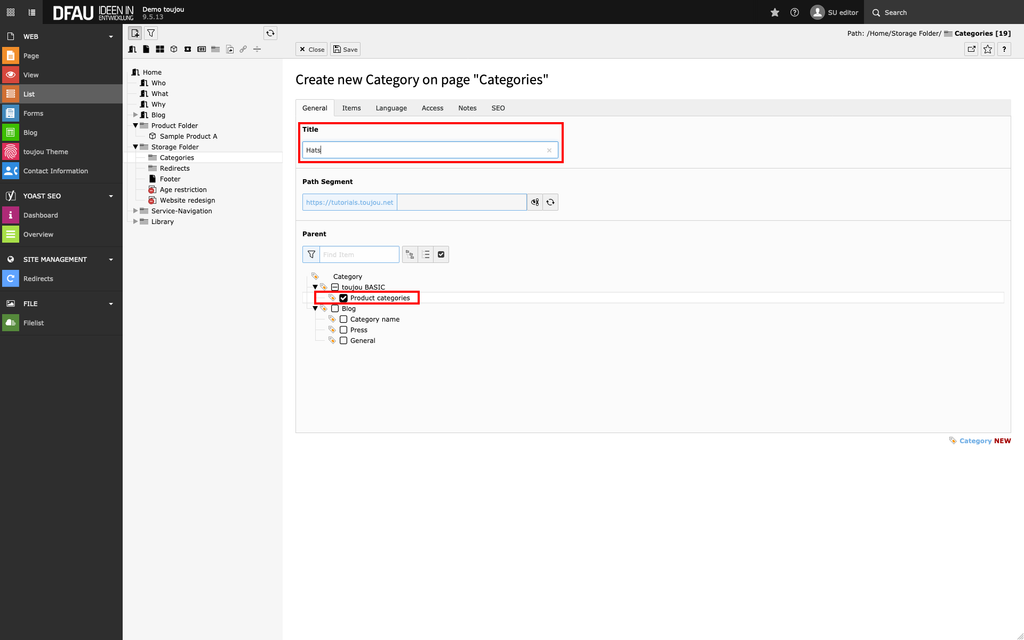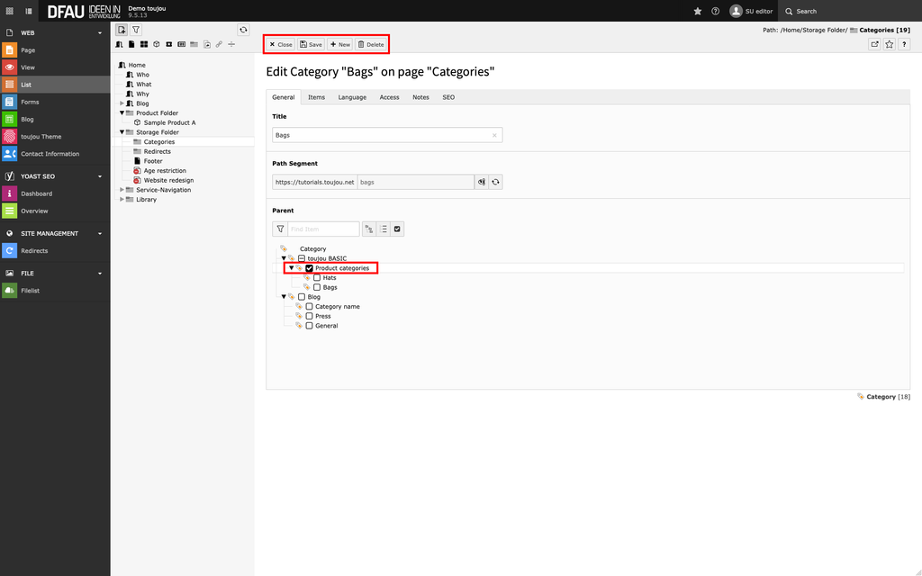 - In the page tree, expand the subsection under the Storage Folder and click the Categories folder.