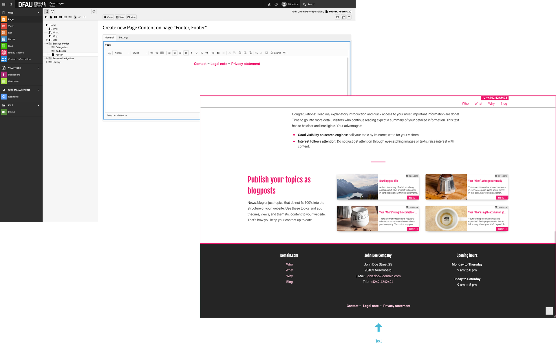 In the page tree of your website you can find the »Service Navigation« folder, which consists of the subpages Contact, Legal note and Privacy statement. Any changes you make in this folder will be automatically reflected in the links in the footer.