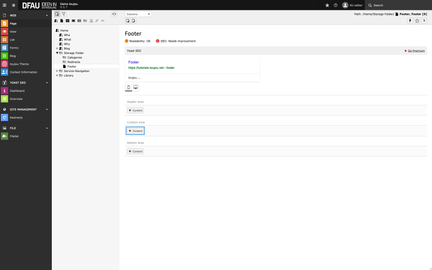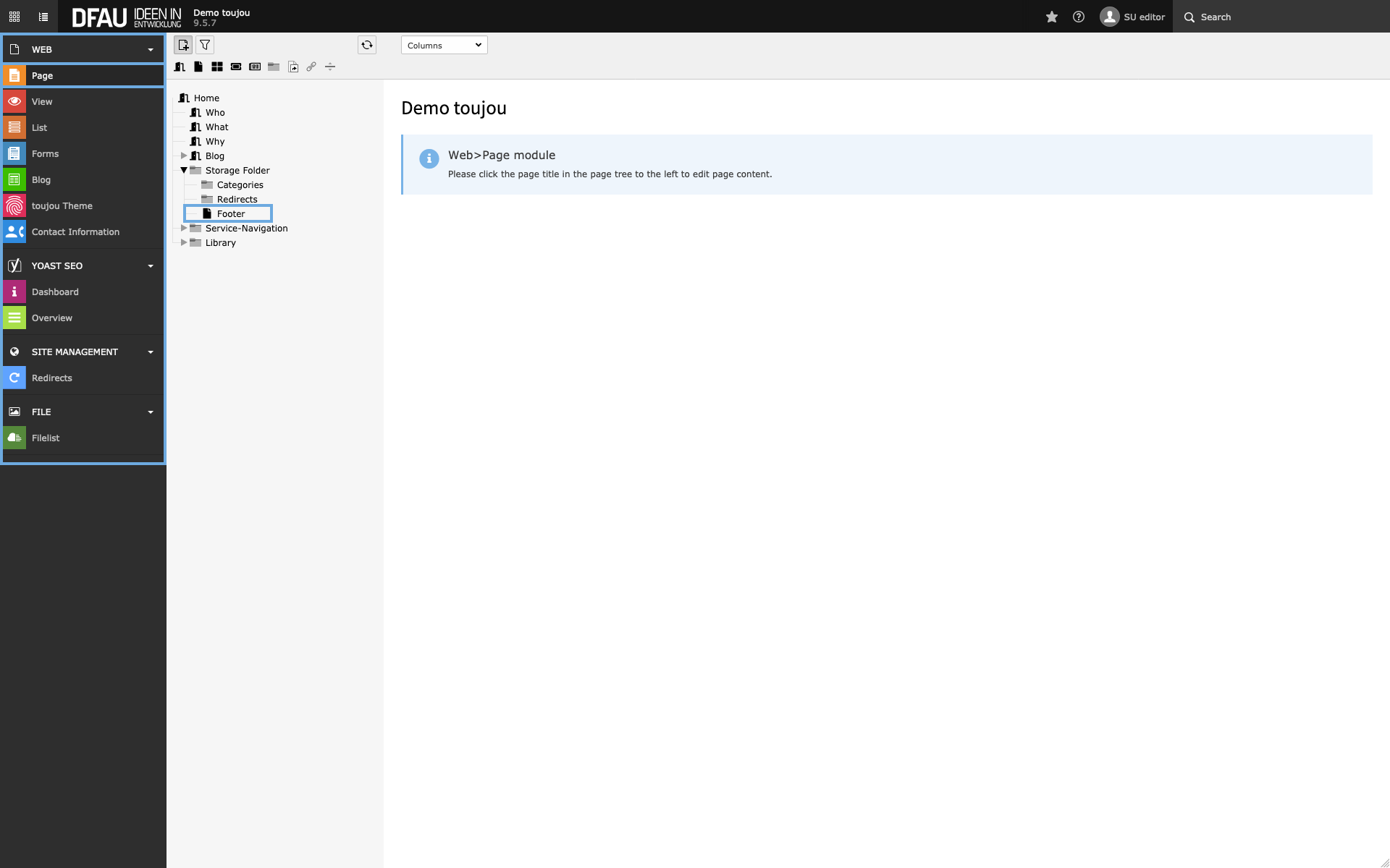 The footer can be found in a folder called »Storage Folder«, similar to a content page. This configuration is always included in every toujou package and should not be changed.