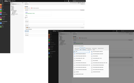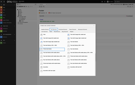 With toujou, you are not restricted to just one single content element when working with a manual footer. To demonstrate, we will now create a second element, Text, below the Three text blocks element.