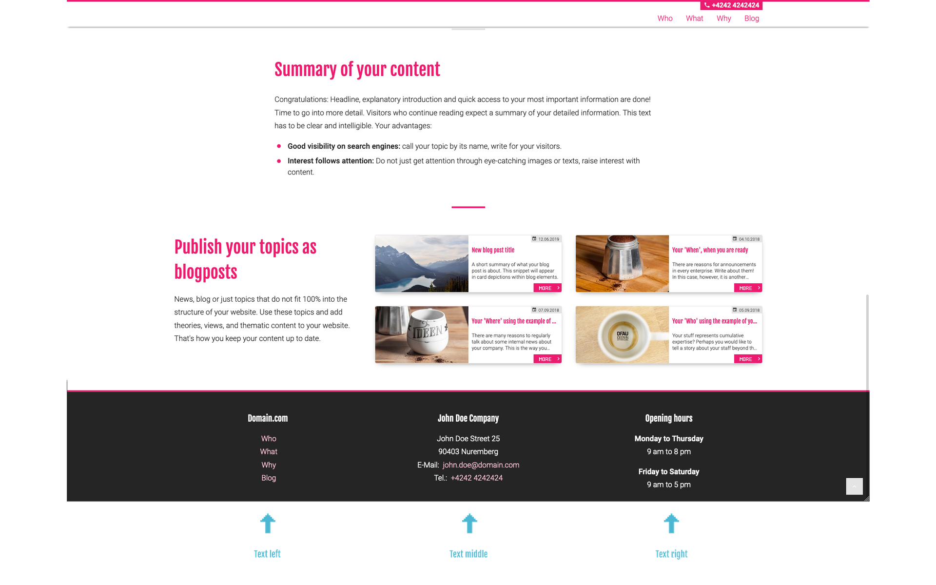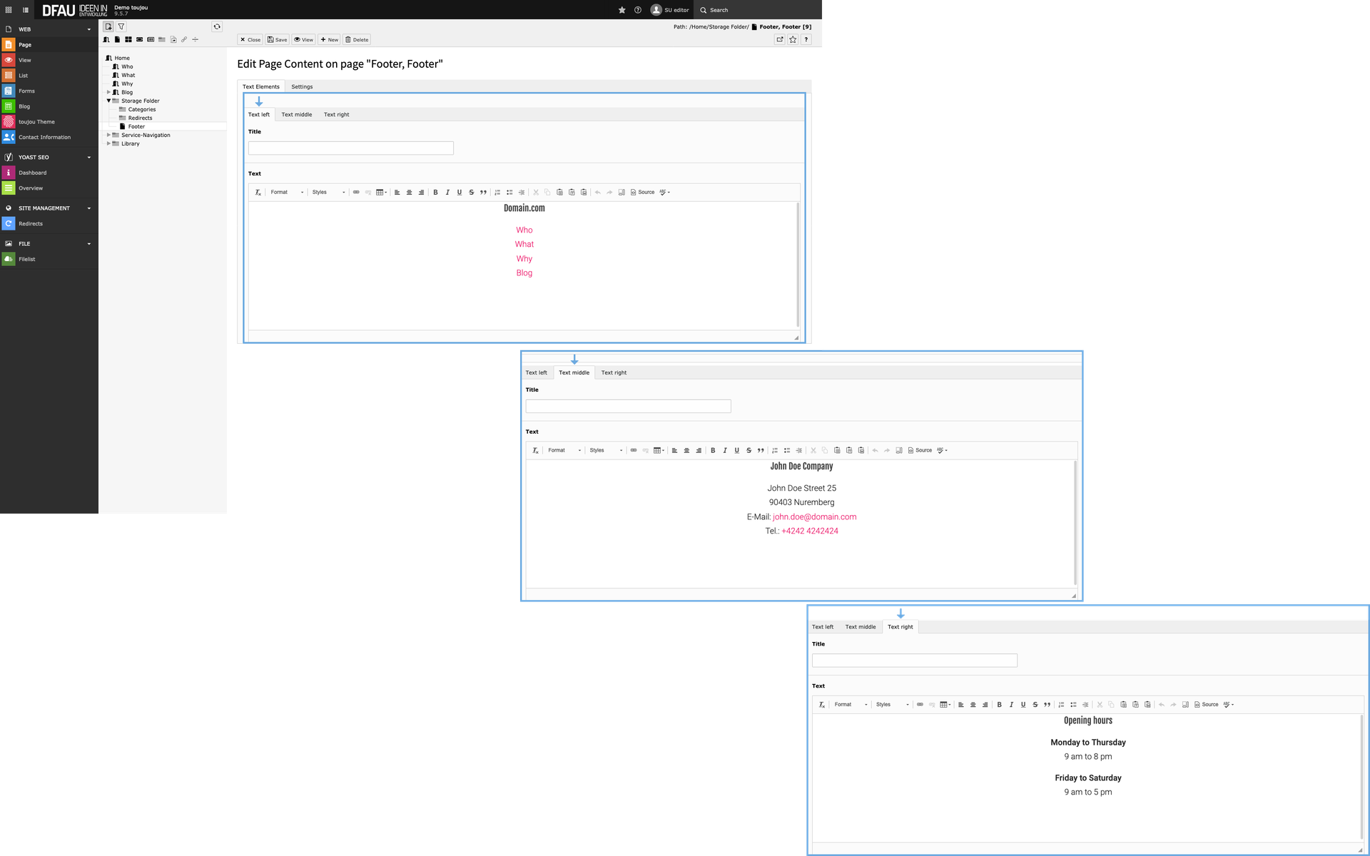 In the Three text blocks element we will create a footer consisting of three instead of four blocks.