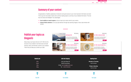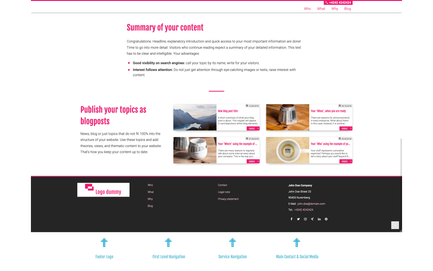 The need for a manual footer depends to a certain extent on the type of business you have and the information that is important for your success. Our footer example that included opening hours is obviously very useful for retailers and companies that rely on customers visiting their brick and mortar business. Other businesses may find it necessary to have their websites display more subpages and navigation levels in the footer, to allow for newsletter subscriptions, link partner logos, and so on. Our advice: Look around at different websites among toujou customers, on the web and/or your competitors and decide what will work best for you.