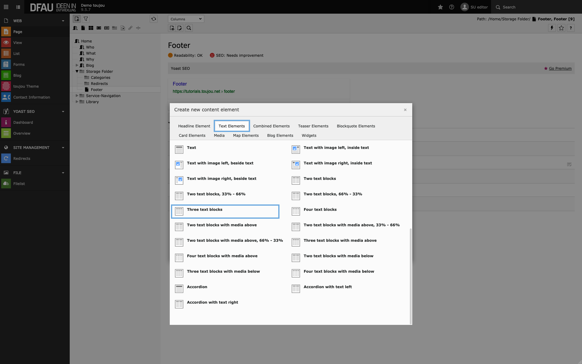 Select the content element of your choice in the element tabs and click on it as usual for editing. As an example case we have chosen the element Three text blocks.